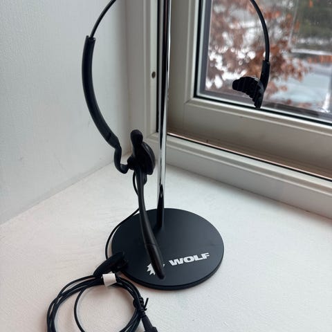 Ladestasjonen fungerer som både holder og lader for headsettet. Hodebøylen er justerbar, og mikrofonarmen kan vinkles for bedre plassering foran munnen. Farge: svart. Materiale er hovedsakelig plast med metallbøyle.