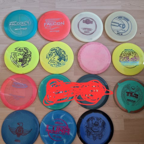 Pakke med frisbeegolf-disker fra ulike merker i blandede farger. Fra nytt, til veldig godt brukt.