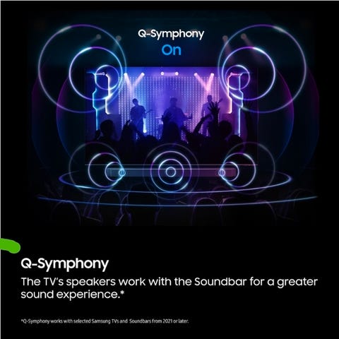 • Q-Symphony: Har du en nyere Samsung-TV, kan høyttalerne i TV-en og lydplanken spille sammen for enda bedre lyd.