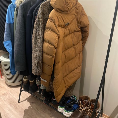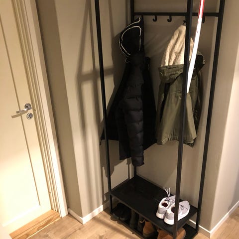 Garderobestativet har en klesstang øverst til oppheng av jakker og klær, samt flere åpne hyller på siden og nederst som kan brukes til oppbevaring av sko, esker eller annet tilbehør. Leveres flatpakket for montering hjemme.