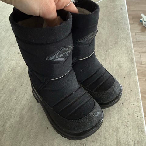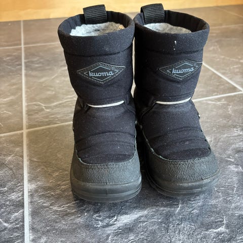 Kuoma vinterstøvler for barn i størrelse 26. Støvlene er svarte med grov såle og varm innside i mykt fôr. Overdelen er i tekstil med forsterket tå- og hælparti. Unisex-modell som passer både gutter og jenter, egnet til bruk i kaldt vær og på snøføre.