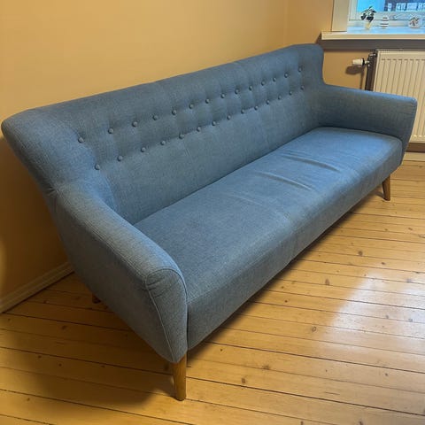 Fin sofagruppe i blå velour. Blå stol, sittehøyde 40 cm, sittepute 60 cm, høyde fra gulv 80 cm. To seter, lengde 120cm, øvrige mål som over, 3 seter, lengde 180, øvrige mål som over. Sofa er litt slitt på hjørnet og mangler noen frynser ved gulv, men eller er alle 3 i god stand. Hver enhet kan selges hver for seg. Vi blir enig om pris