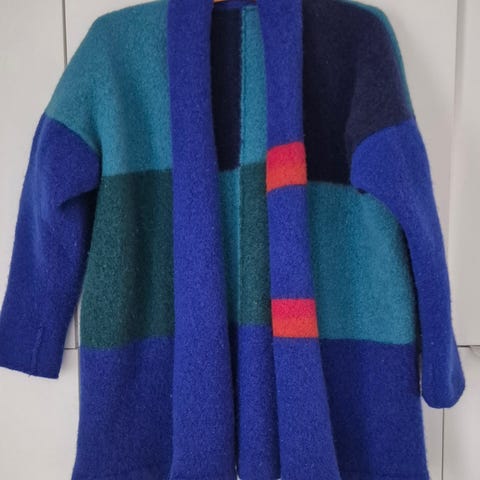 M og laget i ullmateriale. Den har krage, knappelukking foran og store påsydde lommer foran. Fargekombinasjonen består av beige bunnfarge med brune og oransje ruter.
