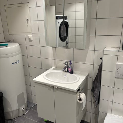 Retro baderomsinnredning som står på bad som skal pusses opp. Fremstår i god stand, ingen synlige feil og mangler.