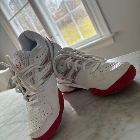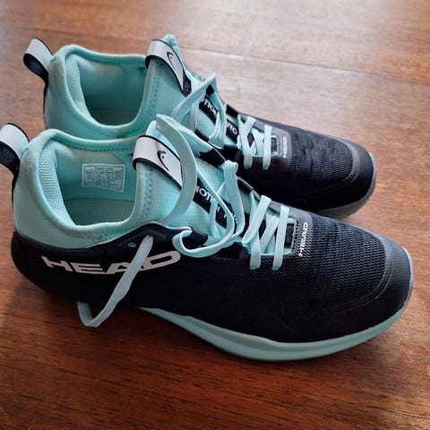 Skoene har snøring foran, polstret hælparti og yttersåle tilpasset racketidrett på bane. Overdelen er i pustende materiale med forsterkninger i tå- og sideparti for bedre stabilitet