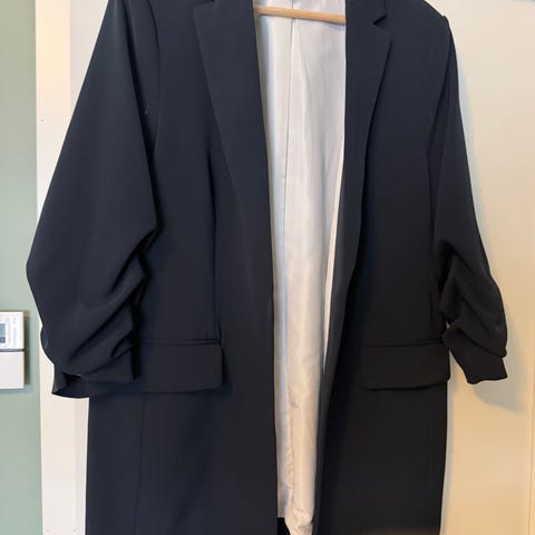 Fransa blazer for dame i størrelse S. Blazeren er svart og laget i polyester. Modellen har en klassisk passform med slag og lommer foran. Ermene er lett oppbrettet på bildene. Egner seg til bruk over topp, skjorte eller kjole, både til hverdags og mer formelle anledninger.