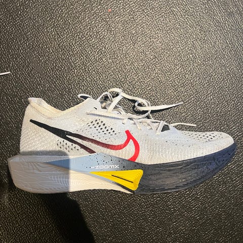 Nike Air Zoom Alphafly Next% 3 PRM joggesko i størrelse 44 (US 10,5 / UK 9,5 / EUR 44). Modellen er en løpeinspirert joggesko med synlig Zoom Air-enhet i forfoten og høy mellomsåle for demping. Overdelen er i lett tekstilmateriale med flerfarget flammedesign og snøring for justerbar passform. Yttersålen har mønster for godt grep på underlaget. Leveres i original eske med oppbevaringspose.