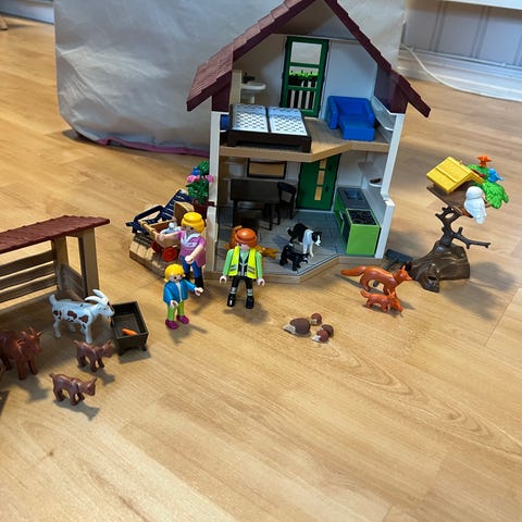 Playmobil bondegård med traktor, to voksne og et barn, samt mange dyr og utstyr til gårdsarbeidet.