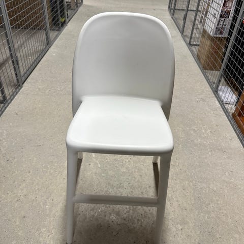 IKEA høy barnestol i plast. Setet er hvitt og leveres med løse ben i grått. Stolen er beregnet for små barn som trenger høy sitteposisjon ved bord. Enkel konstruksjon med avtagbare ben som gjør den lett å oppbevare og transportere.