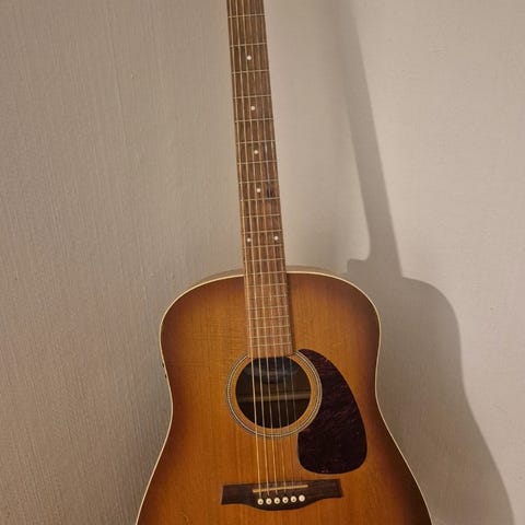 Gitaren er i toppform selv om den har sine bruksmerker. Svært lite båndslitasje og lav strengehøyde. Den har svært lav strengehøyde og er behagelig å spille på med vanlige akkorder. Om du skal imponere med solospill og denslags ville jeg hevet strengehøyden en liten millimeter da det kan bli klirring om du drar på litt i de øvre registrene. Dette kan også fint hende at ordner seg om du har bedre kontroll på luftfuktigheten enn jeg klarer hjemme hos meg. Selv med luftfukter på full guffe så klarer jeg ikke å få fuktigheten i rommet over 35 prosent pga vedfyring nå vinterstid. Dette er i nedre område på hva som er anbefalt for akustiske gitarer med heltre. Så kanskje rett og slett gitaren fortjener et bedre hjem enn jeg kan tilby. Sommerstid så har treverket utvidet seg tilbake til det normale og spiller slik den skal og bør over hele halsen. Gitaren er priset lavt med dette i tankene.
