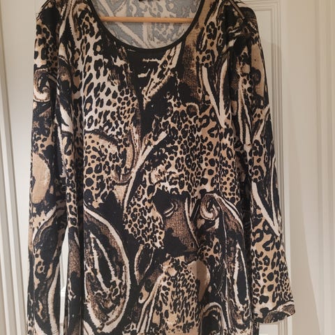 Zavanna bluse i størrelse L for dame. Blusen er flerfarget med et mønstret trykk i ulike dyre- og grafiske motiver. Den har 3/4-lange ermer og knappestolpe foran. Plagget er laget i polyester, som gir et lett og mykt stoff med god bevegelsesfrihet. Passer til hverdagsbruk eller mer pyntede anledninger, kombinert med bukse eller skjørt. Lengde 69 cm