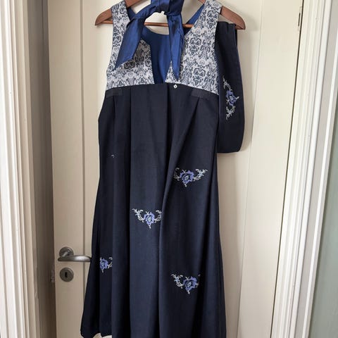 Turkise detaljer som bård nederst, bånd over skuldrer og lomme foran nederst gir kjolen særpreg. Du føler deg fin i denne!