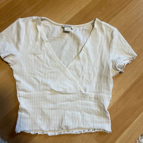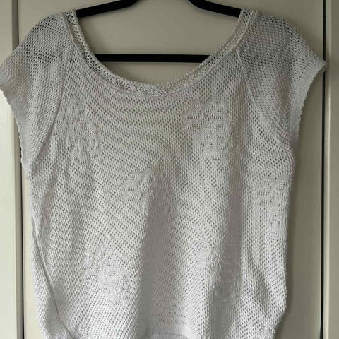 Monki topp i størrelse XS. Toppen er hvit og laget i bomull. Den har heklet/strikket struktur med hullmønster og er ermeløs med rund hals. Passer som sommertopp eller til lag-på-lag over andre plagg.