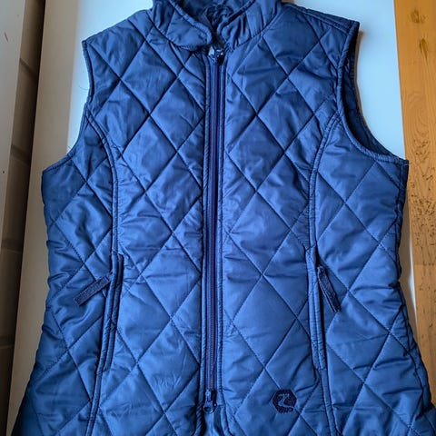 Horze vest med hette i størrelse EU 34 (GB 8, US 6). Vesten er vattert og har glidelås i front. Den er ermeløs og har lengre passform som dekker nedover hoftene. Egnet som ytterlag over genser eller jakke, for eksempel til hverdagsbruk eller stall- og fritidsaktiviteter.