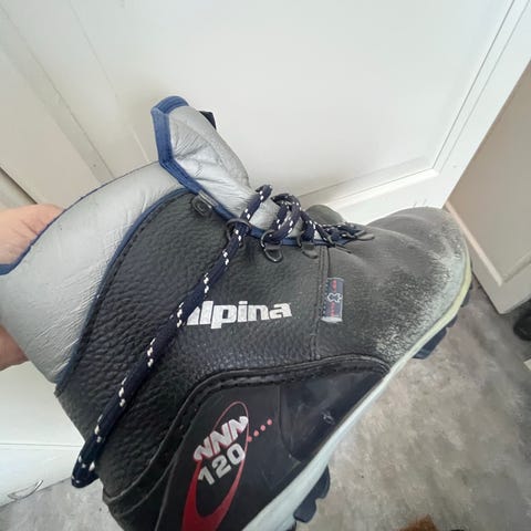 Alpina skistøvler i svart farge. Støvlene har høyt skaft med polstret kant og kraftig snøresystem med kroker og hemper. Overdelen er i glatt lær med forsterkninger rundt hæl og tå.