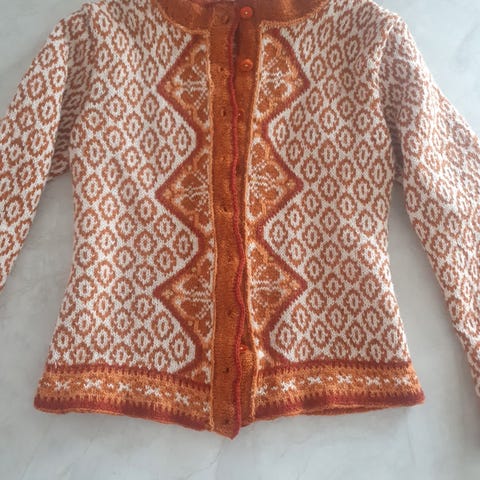 Mønster på genser fra wiola omgjort til jakke strikka i finull mangler knapper brystvidde 51 cm selges for 900 kr kun brukt 2 ganger ble for stor til meg