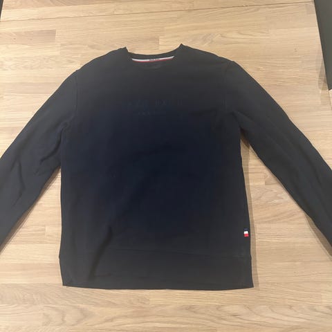 Jean Paul genser for herre i størrelse M. Genseren er blå og laget av bomull. Den har rund hals og strukturert strikkemønster, med ribbestrikkede kanter nederst og på ermene.