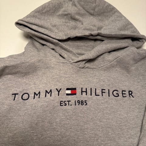 Tommy Hilfiger hettegenser for gutt/ungdom i størrelse 176. Genseren er grå og laget av bomull. Klassisk hette med snitt uten glidelås og kengurulomme foran. Brodert Tommy Hilfiger-logo med flagg og «EST. 1985» på brystet. Ensfarget bakside.