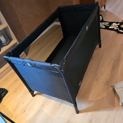 Godt brukt reiseseng. Stoffet er ødelagt på den ene siden, se bilder.