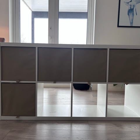 Praktisk hylle med 8 rom, to av dem med skapdører. Passer perfekt på barnerom, kontor eller lignende. Pent brukt. Er en fargeforskjell under hylla så kan ikke brukes stående (på høykant).