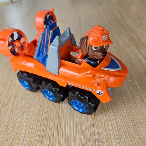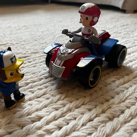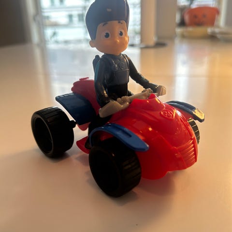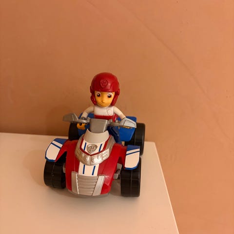 Paw Patrol Ryder figur med bilen. Settet består av en Ryder-figur og en bil. Figuren kan plasseres på kjøretøyet. Plastleke egnet for barn som liker Paw Patrol og kjøretøylek innendørs.
