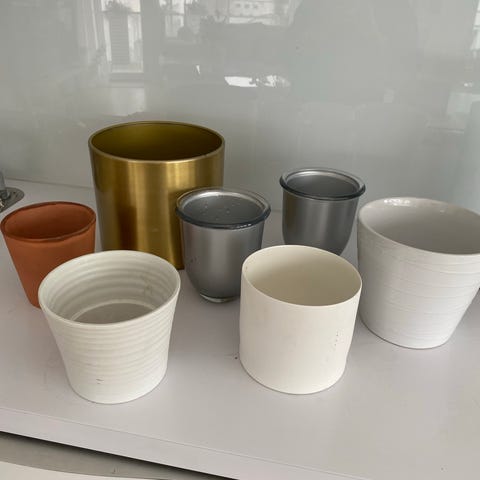 3 stk blomsterpotter kjøpt hos kremmerhuset . Selges for 75 kr pr stk . 14,5 i diameter og høyde 15,5 cm