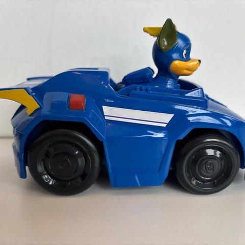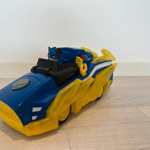 Paw Patrol Chase kjøretøy. Kjøretøyet er i plast. Cockpiten har gjennomsiktig gul frontrute. Figuren Chase følger med og kan plasseres i setet. Det følger også med to gule prosjektildeler som kan festes på kjøretøyet. Egnet som rollelek-leketøy for barn som liker Paw Patrol-universet.