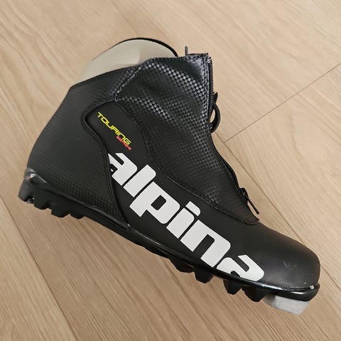 Alpina T8 langrennsstøvler i størrelse 44. Modellen er en klassisk langrennsstøvel med overdel i syntetisk materiale, tekstilfôr og yttersåle i gummi. Fargen er svart med Alpina-logo på siden. Støvlene har glidelås i front og er egnet til bruk med klassiske langrennsbindinger som passer denne såletype.