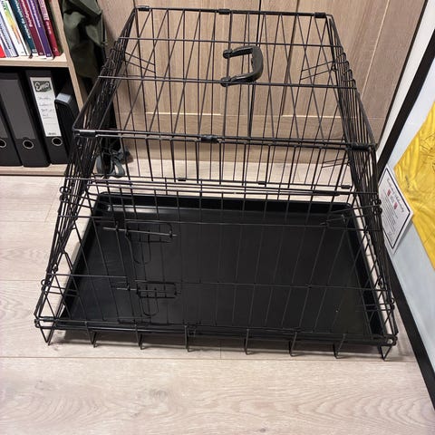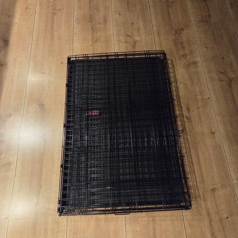 Hundebur i møbelstil i grå farge med gitter og skyvedør i front. Buret er laget som et møbel som kan plasseres innendørs, for eksempel som sidebord. Det har gitter på front og ene side, samt hel vegg på motsatt side. Døren kan åpnes i siden og skyves foran åpningen. Innvendig plass gir rom for hundeseng eller pute. Er brukt som demo i butikk så ikke brukt. Liten avskalling på det ene hjørnet.