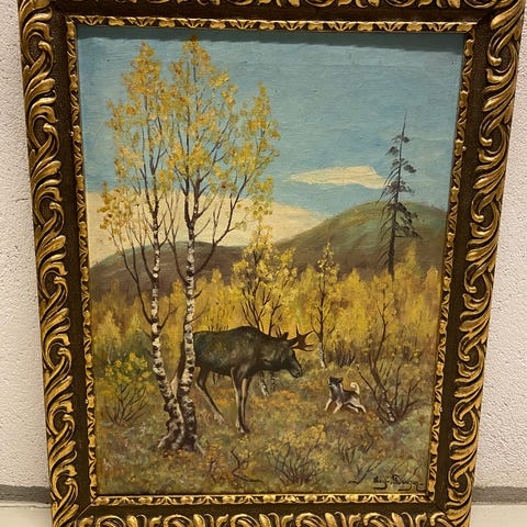 Håkon Kongsrud, oljemaleri på plate, orrfugl i skog.