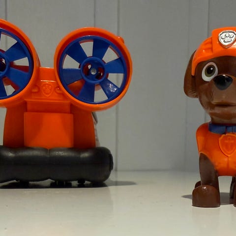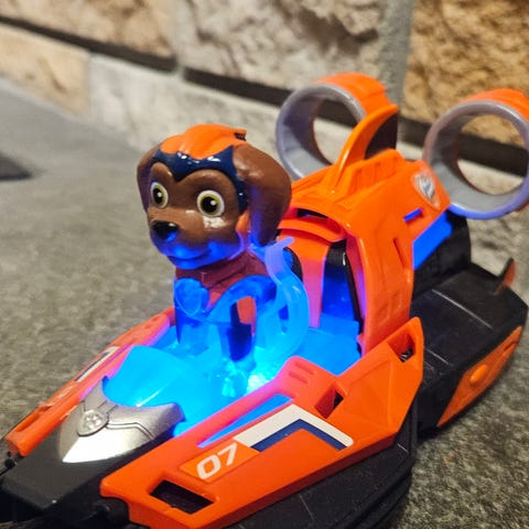 Paw Patrol Zuma lekebåt i oransje plast. Båten har bevegelige deler foran og blå cockpit. Det følger med en liten Zuma-figur som kan plasseres i setet på båten. Lekesettet passer til barn som liker Paw Patrol og rollelek med kjøretøy og figurer.
