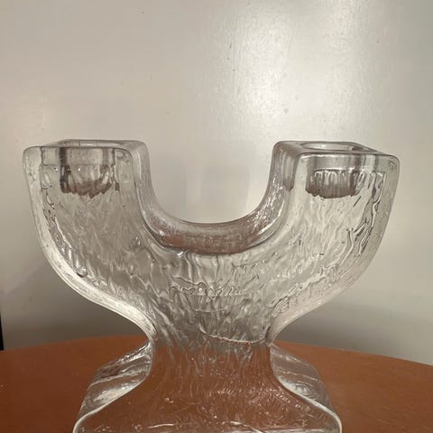 Lysestaken er formet som en elegant "U" og er laget i massivt, klart glass med god tyngde. Den reflekterer lyset vakkert og passer perfekt til to kronelys. Et nydelig eksempel på norsk glassdesign som passer inn i de fleste hjem.