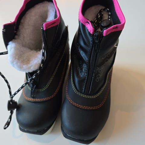 Rossignol langrennsko for barn i svart med rosa detaljer. Skoene har integrert gamasje med glidelås foran og hempe bak for enkel av- og påtaking. Sålen er tilpasset klassisk langrennsbinding (NNN-type). Overdelen er i syntetisk materiale med trykte mønsterdetaljer og kontrastsømmer. Egnet til bruk på langrennsturer for barn som trenger stabile og varme skisko.