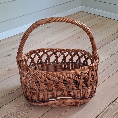Selger pen flettet kurv, veldig pent brukt. Kurven har oval form og åpen topp, med kraftig kant og solid håndtak i midten. Egnet til oppbevaring av for eksempel leker, aviser eller annet smått interiør. Kan brukes både som praktisk oppbevaringsløsning og som enkel dekorasjon i hjemmet.