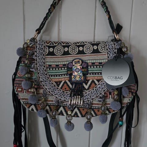 Desigual veske for dame i kunstlær og stoff. Vesken har flerfarget brodert motiv i rosa, lilla, grønt og blått på lys perforert bakgrunn, kombinert med svarte detaljer og mønstret nederkant.