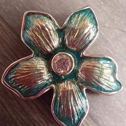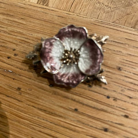 Nydelig vintage brosje formet som en blomst med fire kronblader. Ca. 3.3 i diameter. Ingen synlige skader på emaljen slik jeg kan se, og låsen fungerer som den skal. Den er arvet og har ikke noe stempel eller merke bak, så det er usikkert hvor den er fra.