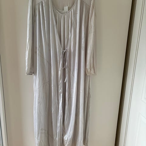 Vintage Braintree sommerkjole for dame i størrelse M. Kjolen er hvit og laget i økologisk bomull. Modellen er lang med trekvartlange ermer og knyting foran, som en liten bolero (sydd fast som en del av kjolen). Pene sømmer i front med empireliv. Lett og tynn kvalitet i to lag. Sval og myk, deilig på varme dager. Fin både til fest og til hverdags, kles enkelt opp eller kan tones ned. Enkel rund halsrigning med fine legg/sømmer i front og lett utskrådd passform med fallende skjørt. Litt ‘flygende gevanter’. Lengden er lengre bak enn i front (se bilder). Deilig kjole å smette inn i med sandaler på føttene 😊.