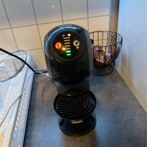 De'Longhi Nescafé Dolce Gusto EDG 600.B kapselmaskin i svart utførelse. Maskinen bruker Nescafé Dolce Gusto-kapsler og har et kompakt, rundt design som tar liten plass på kjøkkenbenken. Vannbeholderen er plassert på baksiden, og det er dryppbrett under koppholderen. Egnet for tilberedning av ulike varme og kalde drikker avhengig av kapseltype. Strømtilkobling med ledning nederst på enheten. Et skrape merke bak på maskinen etter transport til hytta.