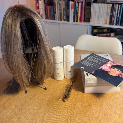 Parykk i kort bob-frisyre i lys blond farge. Lengden er kort til middels, med rett hår og lett sideskill. Egner seg til daglig bruk, kostyme eller som erstatning ved hårtap. Det følger også med en hårbørste og to flasker pleieprodukter, som er beregnet for vedlikehold av parykken. Parykken er kun prøvet på en gang, ny pris kr 10.000. Handlet på Indigo frisør i Horten.