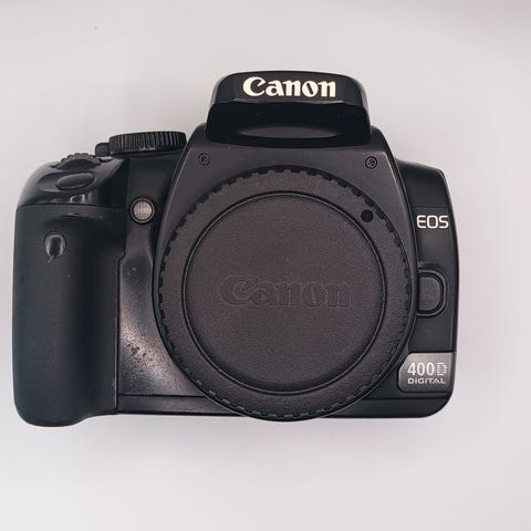 Kamerahus Canon 20D i god stand (500 kroner) Hvis man vil bruke kameraet uten batteri-grep må det anskaffes et deksel til batterirommet.