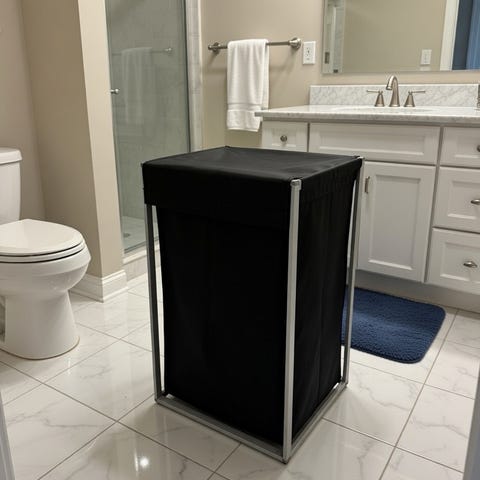 Kraftig skittentøyskurv/oppbevaringskurv med lokk. Naturfarget med hvite detaljer. 50cm høy. Egner seg til oppbevaring av for eksempel skittentøy, tekstiler eller andre husholdningsartikler. Kurven kan plasseres på bad, vaskerom eller soverom etter behov. Selv har jeg brukt den til oppbevaring av leker.