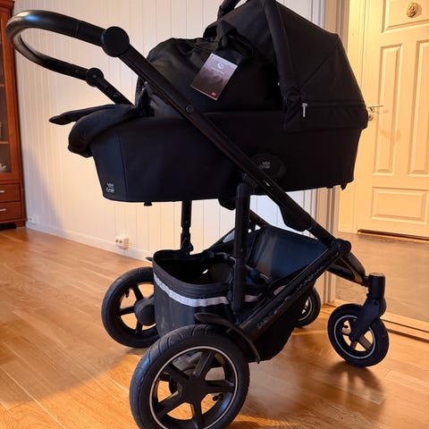Emmaljunga barnevogn i svart farge. Vognen består av understell med store hjul og liggedel, samt en separat sittedel. Liggedelen har hette og liggeflate egnet for spedbarn, mens sittedelen har bøyle og fotstøtte. Understellet har handlekasse under vognen for oppbevaring. Passer til bruk fra nyfødt med liggedel og videre med sittedel når barnet blir større.