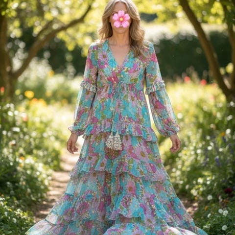 Fra nett: Chiffon Maxi Dress New York Blossom fra By Timo. Vakker maxi-kjole i lett og deilig chiffon-kvalitet, og med et helt nydelig blomsterprint. En perfekt kjole til bryllup eller andre festlige anledninger.