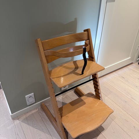Stokke Tripp Trapp barnestol i tre med naturfarget finish. Stolen har justerbar sitteplate og fotbrett som kan tilpasses barnets høyde. Den leveres med bøyle og rem foran for økt støtte til mindre barn. Egnet som spise- og sitteplass ved bord for barn over tid, ettersom høyden kan reguleres etter behov.