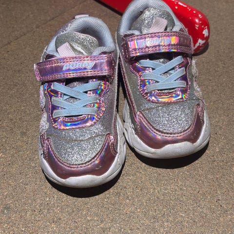 Skechers joggesko til jente i størrelse 21. Skoene er flerfarget med rosa, lilla og blå toner samt detaljer i sølv. Modellen har borrelås og elastiske lisser over vristen for enkel av- og påkledning. Polstret innside og hælkappe gir behagelig passform. Yttersålen er i gummi med mønster av stjerner og hjerter for godt grep. Egnet som hverdagssko og til lek for små barn.