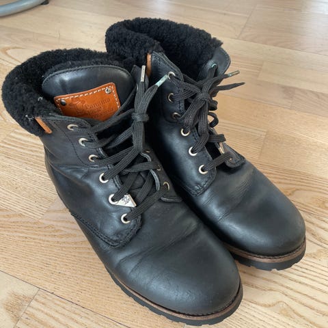 Panama Jack vinterstøvler i størrelse 40. Støvlene er i svart skinn med kraftig gummisåle med grovt mønster. De har snøring foran, metallmaljer og polstret, myk innerside som gir ekstra varme rundt ankelen. Passer som varme og robuste støvler til bruk i kaldere vær og på glatte underlag.