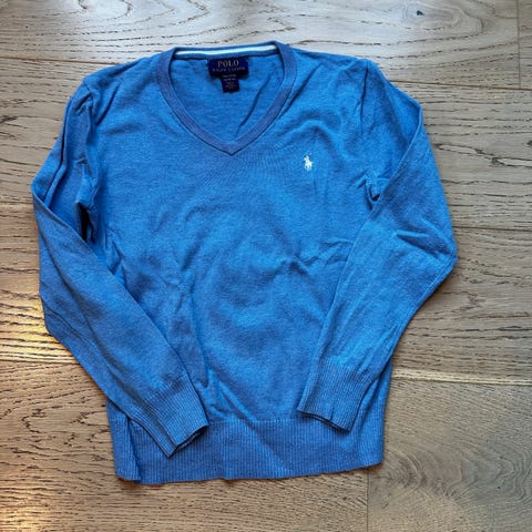 Polo Ralph Lauren genser for gutt i barnestørrelse M. Genseren er i en nydelig lyseblå farge i pimabomull med rund hals og lange ermer. Den har ribbestrikkede kanter i hals, ermer og nederkant, samt brodert Polo Ralph Lauren-logo på brystet. Passer til hverdagsbruk og kan brukes alene eller over en skjorte eller t‑skjorte.