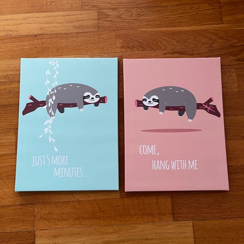IKEA barnerom bilder med dovendyr motiv i to ulike farger. Det ene bildet har bakgrunn i dus oransje med teksten «Come, hang with me», og det andre har lys grønn bakgrunn med teksten «Just 5 more minutes…». Begge bildene viser et dovendyr som ligger på en gren. Bildene er montert på lette plater med ramme på baksiden og opphengsløsning, egnet til å henge på vegg på barnerom eller lekerom. Flerfarget motiv i dempede pastellfarger.