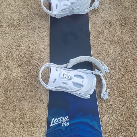 Leveres som vist på bildene, med snowboard og tilhørende bindinger, og sko.