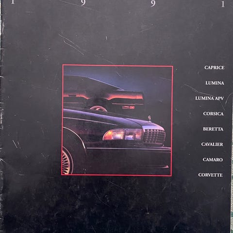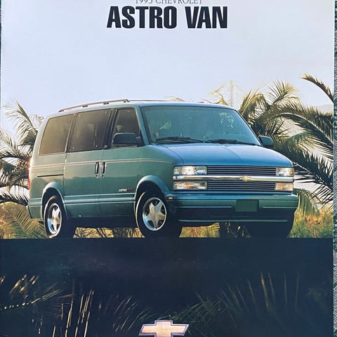 Trykt salgsmateriell med bilder av eksteriør og interiør, tekniske spesifikasjoner og tekstbeskrivelse av modellen. Viser blant annet frontparti med grill og lykter, seteløsninger i kupeen, ratt og førermiljø samt tabell med mål, vekt, motor- og utstyrsdata for Chevrolet Astro.